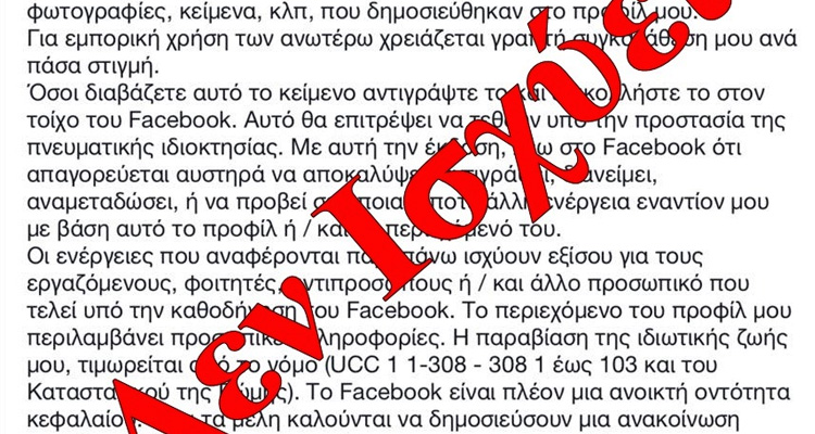 Ένα παλιό παραπλανητικό μήνυμα άρχισε πάλι να κυκλοφορεί στο Facebook . Το μήνυμα προτρέπει όλους όσους το διαβάζουν να το αναδημοσιεύσουν άμεσα για να προστατέψουν τα δεδομένα τους. Φυσικά αυτό δεν ισχύει καθώς στην εγγραφή, ο χρήστης αποδέχεται τους όρους χρήσης του κοινωνικού δικτύου. Πάντως αν θέλετε να προστατεύσετε τα προσωπικά σας δεδομένα, φωτογραφίες κ.α., ο τρόπος είναι πολύ απλός:
