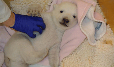 Το αρκουδάκι γεννήθηκε το Νοέμβριο με άλλα τρία και είναι το μόνο που επέζησε. Ζυγίζει 4,4 κιλά και τρώει προς το παρόν μόνο γάλα.