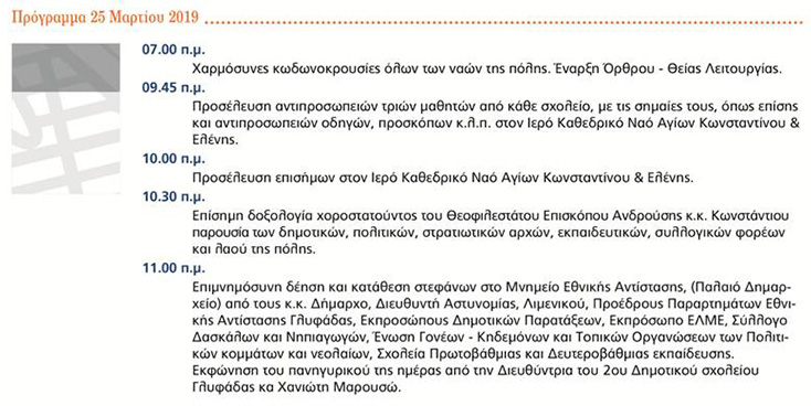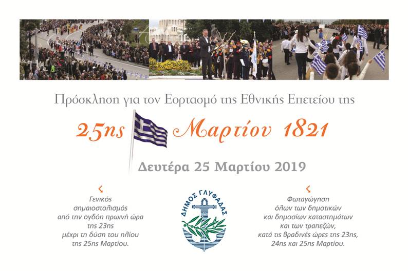 Ο εορτασμός της εθνικής επετείου της 25ης Μαρτίου στη Γλυφάδα pinelopi LIVING IN THE SOUTH 21 Μαρτίου, 2019 Ο εορτασμός της εθνικής επετείου της 25ης Μαρτίου στη Γλυφάδα Αφετηρία παρέλασης: Διαδόχου Παύλου και Αύρας.