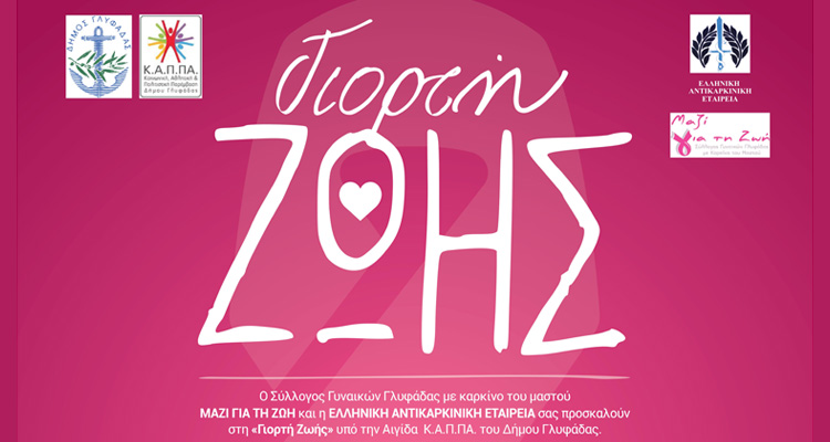 Ο Σύλλογος Γυναικών Γλυφάδας (με καρκίνο μαστού) Μαζί για τη Ζωή, σας προσκαλεί σε μια μεγάλη «Γιορτή Ζωής» που θα πραγματοποιηθεί την Κυριακή 23/10/2016, στο Παλαιό Δημαρχείο Γλυφάδας (Σάκη Καράγιωργα 2 & Διαδόχου Παύλου), παρουσιάζοντας πολυποίκιλες δράσεις (10:00-14:00), υπό την Αιγίδα ΚΑΠΠΑ του Δήμου Γλυφάδας.