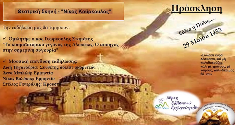Εκδήλωση μνήμης για την Άλωση και την πτώση της Κωνσταντινούπολης θα πραγματοποιήσει ο Σύλλογος Κωνσταντινουπολιτών & Μικρασιατών Ελληνικού – Αργυρούπολης, τη Δευτέρα 29 Μαΐου 2023 στις 20:00, στη θεατρική σκηνή «Νίκος Κούρκουλος» (Ολυμπίας 5, Αργυρούπολη).
